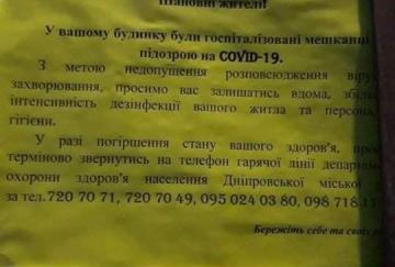 У Дніпрі позначили будинки, де живуть люди з підозрою на коронавірусУ Дніпрі на будинках, де живуть госпіталізовані з підозрою на коронавірус, позначили відповідним оголошенням